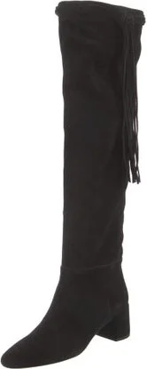 Saint Laurent Suede Over-The-Knee Boots Black Semi-Pointed Toes with Fringe Trim Accent Fit: This style typically runs a half size small. Read more