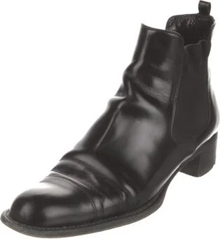Prada Leather Ankle Chelsea Boots Black Round-Toes Platform Includes Box Fit: This style typically runs a half size small. Unfortunately, due to restrictions, this item may not be eligible for shippin Read more