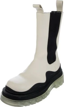 Bottega Veneta Leather Mid-Calf Chelsea Boots Neutrals Rubber Trim Square-Toes Platform Unfortunately, due to restrictions, this item may not be eligible for shipping in all areas. Read more