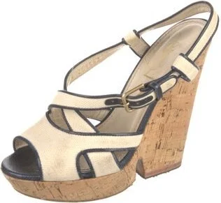 Saint Laurent Canvas Slingback Sandals Neutrals Leather Trim Platform Straps & Buckle Closure at Sides Fit: Sandals by Saint Laurent typically run small, consider taking a half size up. Read more
