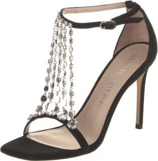 Stuart Weitzman Suede T-Strap Sandals Black Crystal Embellishments Wrap-Around Straps & Buckle Closure at Sides Includes Box & Dust Bag Designer Fit: This designer typically runs true to size. Read more