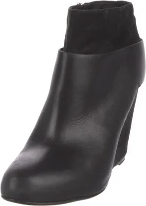 Vince Leather Ankle Boots Black Suede Trim Semi-Pointed Toes Exposed Zip Closure at Sides Unfortunately, due to restrictions, this item may not be eligible for shipping in all areas.