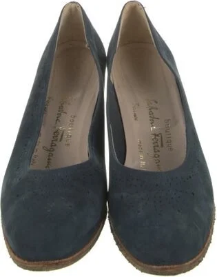 Salvatore Ferragamo Suede Pumps Blue Leather & Rubber Trim Round-Toes with Lasercut Accents Fit: This style typically runs a half size small. Read more
