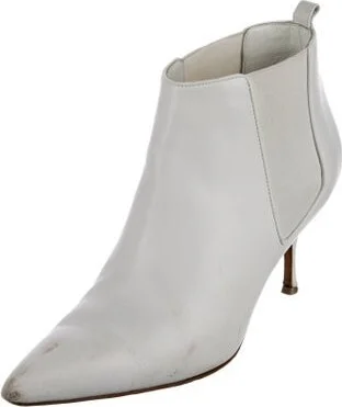 Manolo Blahnik Leather Ankle Boots White Pointed-Toes Designer Fit: This style typically runs a full size small. Unfortunately, due to restrictions, this item may not be eligible for shipping in all areas.