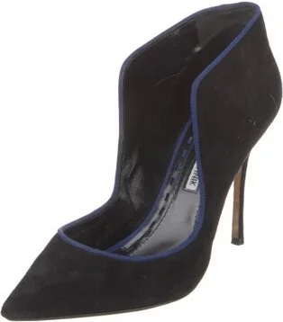 Manolo Blahnik Suede Pumps Black & Blue Leather Trim Pointed-Toes with Grosgrain Trim Fit: This style typically runs narrow and a half size small. Read more