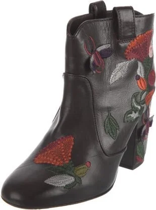 Laurence Dacade Leather Ankle Boots Brown Floral Print Round-Toes with Embroidered Accent Wrap-Around Straps Unfortunately, due to restrictions, this item may not be eligible for shipping in all areas Read more
