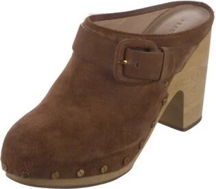 Veronica Beard Suede Mules Brown Semi-Pointed Toes with Studded Accents Platform Crossover Straps & Buckle Closure At Uppers