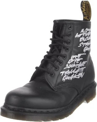 Dr. Martens Leather Ankle Combat Boots Black Graphic Print Round-Toes with Embroidered Accent Platform Lace-Up Closure at Uppers Unfortunately, due to restrictions, this item may not be eligible for shipping in all areas.