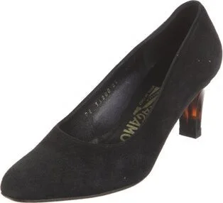 Salvatore Ferragamo Suede Pumps Black Acrylic & Leather Trim Semi-Pointed Toes Fit: This style typically runs a half size small. Read more