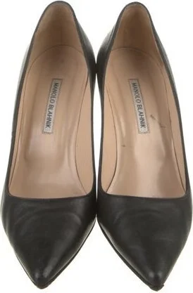 Manolo Blahnik Leather Pumps Black Pointed-Toes Fit: This style typically runs narrow and a half size small. Unfortunately, due to restrictions, this item may not be eligible for shipping in all areas Read more