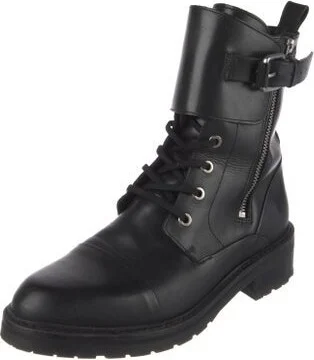 AllSaints Leather Ankle Combat Boots Black Round-Toes Wrap-Around Straps & Exposed Zip Closure at Sides Unfortunately, due to restrictions, this item may not be eligible for shipping in all areas. Read more
