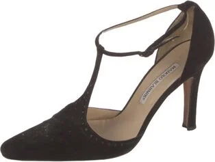 Manolo Blahnik Suede T-Strap Pumps Black Semi-Pointed Toes Wrap-Around Straps & Buckle Closure at Ankles Fit: This style typically runs narrow and a half size small. Read more