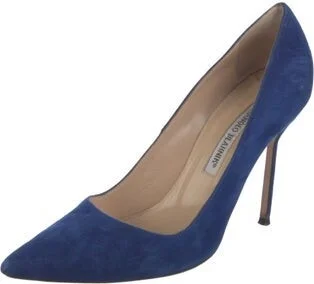 Manolo Blahnik Suede Pumps Blue Leather Trim Semi-Pointed Toes Fit: This style typically runs narrow and a half size small. Read more