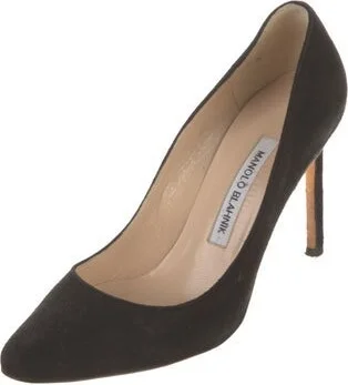 Manolo Blahnik Suede Pumps Black Semi-Pointed Toes Fit: This style typically runs narrow and a half size small.