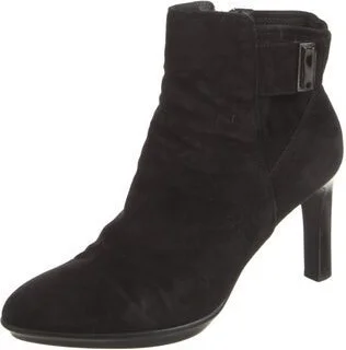 Aquatalia Suede Ankle Boots Black Leather Trim Semi-Pointed Toes Exposed Zip Closure at Sides Includes Box Fit: Boots by Aquatalia typically run small, consider taking a half size up. Read more