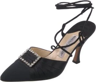 Manolo Blahnik Satin Slingback Pumps Blue Leather Trim Semi-Pointed Toes with Crystal Embellishments Wrap-Around Straps & Tie Closures Includes Dust Bag Fit: This style typically runs narrow and a hal Read more