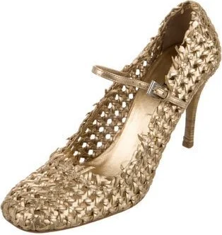 Prada Leather Pumps Gold Square-Toes Mary Jane Strap & Buckle Closure At Uppers Designer Fit: Pumps by Prada typically run a half size small. Unfortunately, due to restrictions, this item may not be e Read more