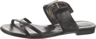 Manolo Blahnik Leather Slides Black Buckle Closure At Uppers Includes Dust Bag Fit: This style typically runs narrow and a half size small. Unfortunately, due to restrictions, this item may not be eligible for shipping in all areas.