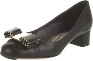 Salvatore Ferragamo Leather Pumps Black Round-Toes with Bow Accents Includes Box Fit: This style typically runs a half size small. Unfortunately, due to restrictions, this item may not be eligible for shipping in all areas.
