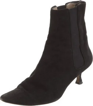Manolo Blahnik Suede Ankle Boots Black Leather & Nylon Trim Semi-Pointed Toes Designer Fit: This style typically runs a full size small.