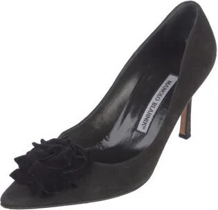 Manolo Blahnik Suede Pumps Black Floral Print Semi-Pointed Toes Includes Box & Dust Bag Fit: This style typically runs narrow and a half size small.