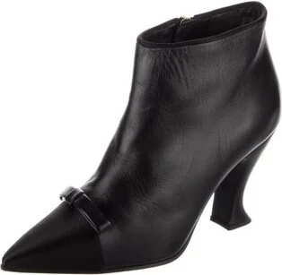 Chanel Lambskin Ankle Boots Black Interlocking CC Logo Pointed-Toes with Bow Accents Exposed Zip Closure at Sides Includes Dust Bag Fit: This style typically runs a full size small. Read more