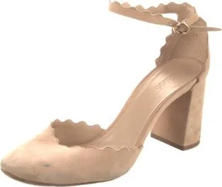 Chloé Suede D'Orsay Pumps Neutrals Round-Toes with Scalloped Accent Wrap-Around Straps & Buckle Closure at Ankles Designer Fit: Pumps by Chloé typically run a half size small. Read more