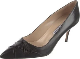 Manolo Blahnik Leather Pumps Black Semi-Pointed Toes Includes Box Fit: This style typically runs narrow and a half size small. Unfortunately, due to restrictions, this item may not be eligible for shipping in all areas.