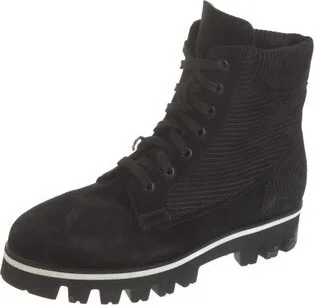 Aquatalia Suede Ankle Combat Boots Black Leather & Rubber Trim Round-Toes Exposed Zip Closure at Sides Fit: Boots by Aquatalia typically run small, consider taking a half size up.