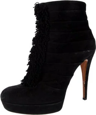 Gucci Suede Ankle Lace-Up Boots Black Round-Toes with Fringe Trim Accent Platform Concealed Zip Closure at Sides Includes Dust Bag & Additional Heel Caps Fit: This style typically runs a half size small.