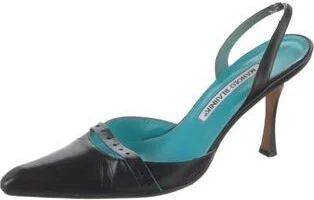 Manolo Blahnik Leather Slingback Pumps Black Pointed-Toes Straps Fit: This style typically runs narrow and a half size small. Unfortunately, due to restrictions, this item may not be eligible for shipping in all areas.