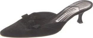 Manolo Blahnik Suede Mules Black Semi-Pointed Toes with Bow Accents Fit: This style typically runs narrow and a half size small. Read more