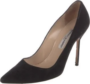 Manolo Blahnik Suede Pumps Black Semi-Pointed Toes Fit: This style typically runs narrow and a half size small.