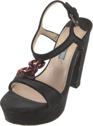 Prada Canvas Sandals Black Chain-Link Accents Platform Buckle Closure at Ankles Size not listed, estimated from measurements. Designer Fit: Sandals by Prada typically run a half size small. Read more