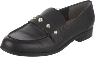 Stuart Weitzman Leather Loafers Black Faux Pearl Accents Round-Toes with Beaded Accents Crossover Straps & Buckle Closure At Uppers Designer Fit: This designer typically runs true to size. Unfortunate Read more