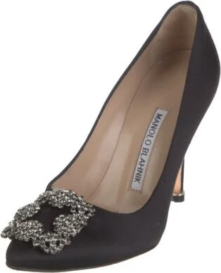 Manolo Blahnik Satin Pumps Black Leather Trim Semi-Pointed Toes with Crystal Embellishments Includes Box & Dust Bag Fit: This style typically runs narrow and a half size small.