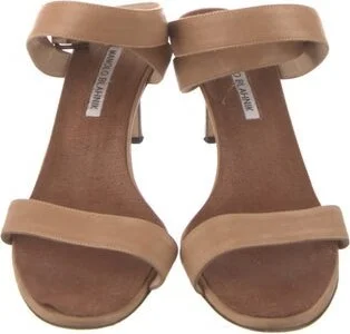 Manolo Blahnik Leather T-Strap Sandals Neutrals Wrap-Around Straps & Buckle Closure at Ankles Fit: This style typically runs narrow and a half size small. Unfortunately, due to restrictions, this item may not be eligible for shipping in all areas.