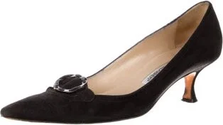 Manolo Blahnik Suede Pumps Black Semi-Pointed Toes Fit: This style typically runs narrow and a half size small. Read more