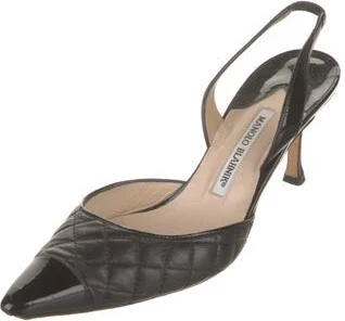 Manolo Blahnik Leather Slingback Pumps Black Pointed-Toes Straps Fit: This style typically runs narrow and a half size small. Unfortunately, due to restrictions, this item may not be eligible for shipping in all areas.