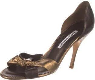Manolo Blahnik Leather D'Orsay Pumps Black & Gold Round-Toes Fit: This style typically runs narrow and a half size small. Unfortunately, due to restrictions, this item may not be eligible for shipping Read more