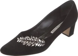Manolo Blahnik Suede Pumps Black Round-Toes with Crystal Embellishments Includes Box Fit: This style typically runs narrow and a half size small. Read more