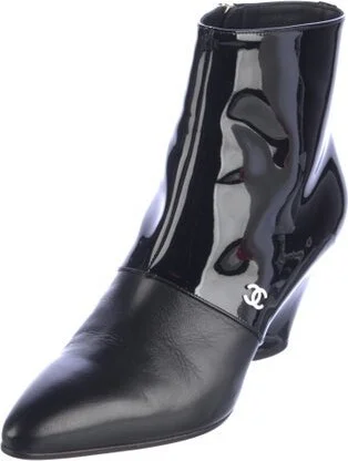 Chanel Patent Leather Ankle Boots From the 2020 Collection by Virginie Viard Black Interlocking CC Logo Lambskin Trim Pointed-Toes Exposed Zip Closure at Sides Includes Dust Bag Fit: This style typica Read more