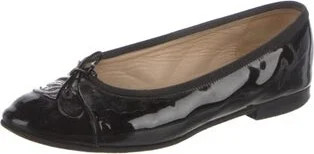 Chanel Vintage Ballet Flats By Karl Lagerfeld Black Patent Leather Interlocking CC Logo Grosgrain & Bow Accents Semi-Pointed Toes Designer Fit: This style typically runs narrow and a half size to a full size small.