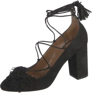 Aquazzura Suede Pumps Black Semi-Pointed Toes with Tassel Accents Wrap-Around Straps Read more