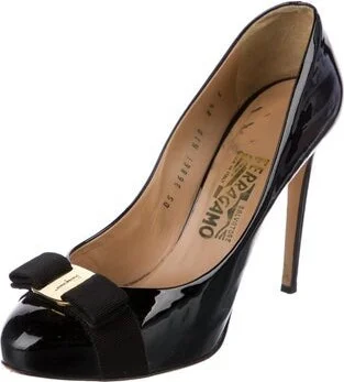 Salvatore Ferragamo Patent Leather Pumps Black Grosgrain & Bow Accents Round-Toes Platform Fit: This style typically runs a half size small. Read more