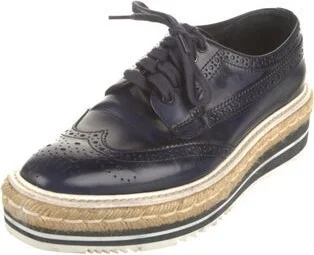 Prada Leather Oxfords Blue Jute Trim Round-Toes with Lasercut Accents Platform Lace-Up Closure at Uppers Designer Fit: Flats by Prada typically run a half size small. Unfortunately, due to restriction Read more