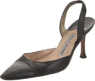 Manolo Blahnik Leather Slingback Pumps Black Semi-Pointed Toes Straps Fit: This style typically runs narrow and a half size small. Unfortunately, due to restrictions, this item may not be eligible for shipping in all areas.