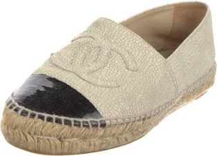 Chanel Leather Espadrilles By Karl Lagerfeld Neutrals Interlocking CC Logo Jute, Rubber & Patent Leather Trim Round-Toes Platform Designer Fit: This style typically runs narrow and a half size to a full size small. Unfortunately, due to restrictions, this item may not be eligible for shipping in all areas.