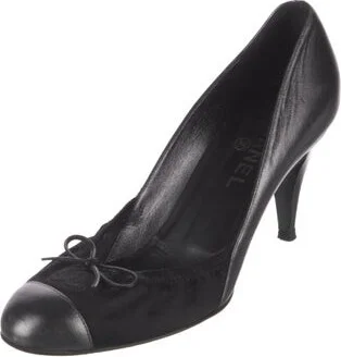 Chanel Leather D'Orsay Pumps By Karl Lagerfeld Grey & Metallic Interlocking CC Logo Satin Trim Round-Toes with Bow Accents Designer Fit: This style typically runs narrow and a half size small. Unfortu Read more