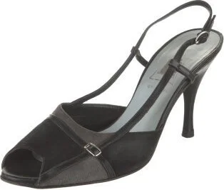 Bruno Magli Suede Slingback Pumps Black Leather Trim Peep-Toes Straps & Buckle Closure at Ankles Reconsign: Unfortunately, this brand is no longer eligible for consignment.